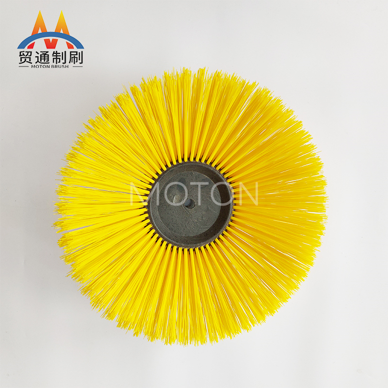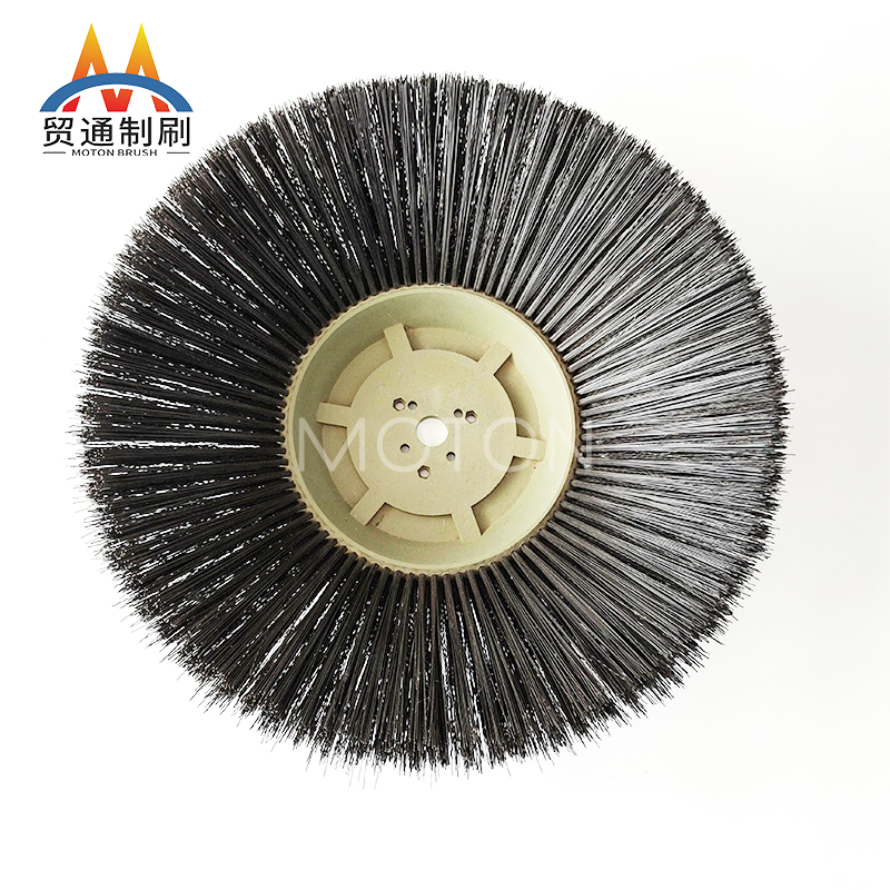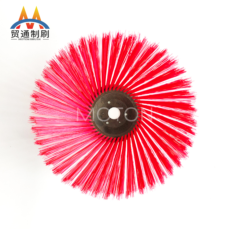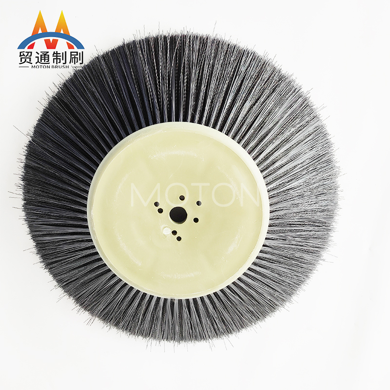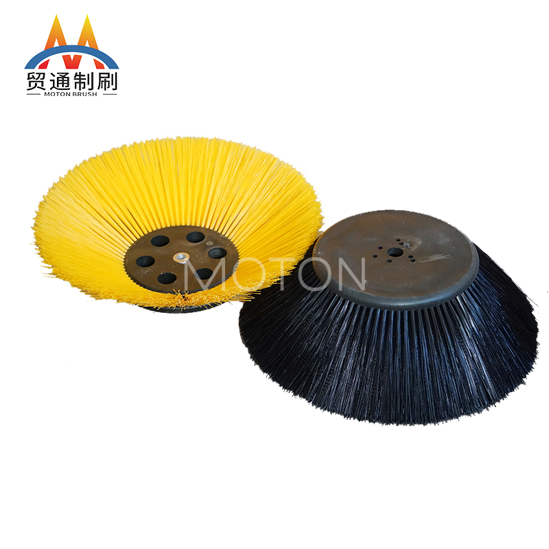 环卫刷是在切割好的PP圆盘上成一定角度钻孔,再用切好的扁钢丝或PP刷丝、尼龙丝对折后串插而成的刷子。